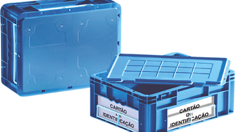 For industrial use and similar uses. Can be used with lid. Has a slot to place an identification card (50/60 mm x 210 mm). Can be sealed when used with lid (on 3 sides). Has textured areas for adhesive labels. Container is supplied with closed handles. Totally smooth outside of base for easy transport on treadmills. Stacking compatible with 1200 x 1000 pallets and with CN 14 containers.