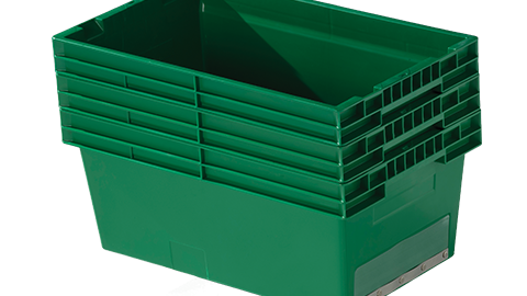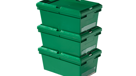 Plastic box with lid, specially designed for transporting and distributing medicines. It provides a holder for an identification card (40 x 205 mm card). The lid is adapted for use with a seal and lifting straps. Provides 70% reduction in volume in return stacking.