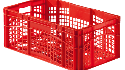 Perforated 51.5 L plastic box with handles, specially designed for storing 20 dozen eggs in trays. Perforated sides and bottom facilitate product ventilation.