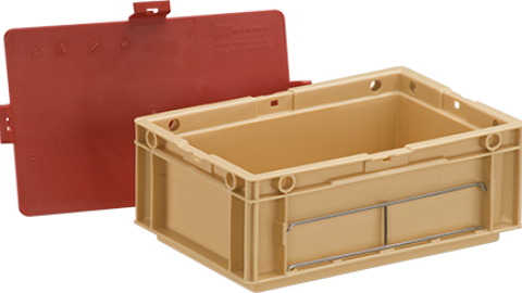 Contentor para uso geral na indústria, fornecido só na versão fechada. Fornecido com porta-etiqueta metálico somente em uma face conforme foto. Possui local texturizado para a colocação de etiqueta auto-adesiva. Permite empilhamento mesmo quando utilizado com tampa. Peso do contentor sem porta-etiquetas: +/- 540 g. Carga máxima para uma pilha: 225 kg. Limite de carga quando paletizada: 1300 kg. *Pode ser fornecido com porta-cartão plástico.