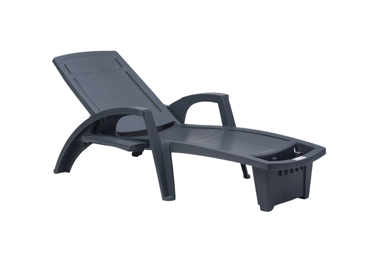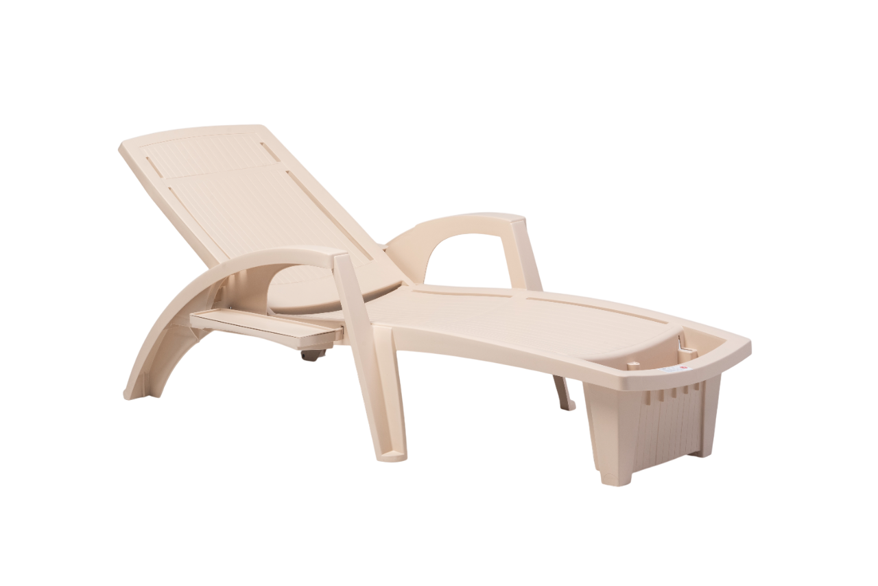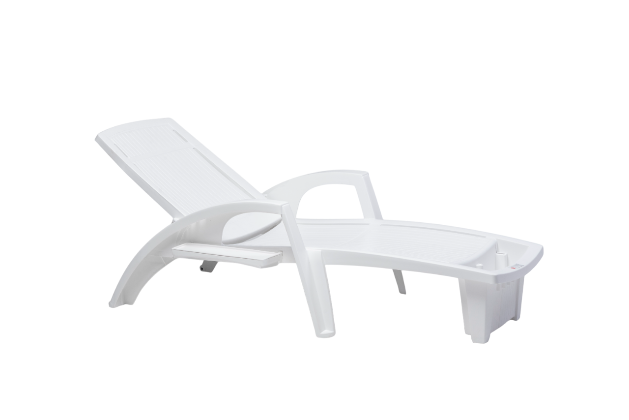 Resistente, leve e fácil de limpar, permite empilhamento entre si, possui encosto reclinável em 4 estágios, roletes para deslocamento, porta-objetos e apoio utilizando a tampa do porta-objetos como base.